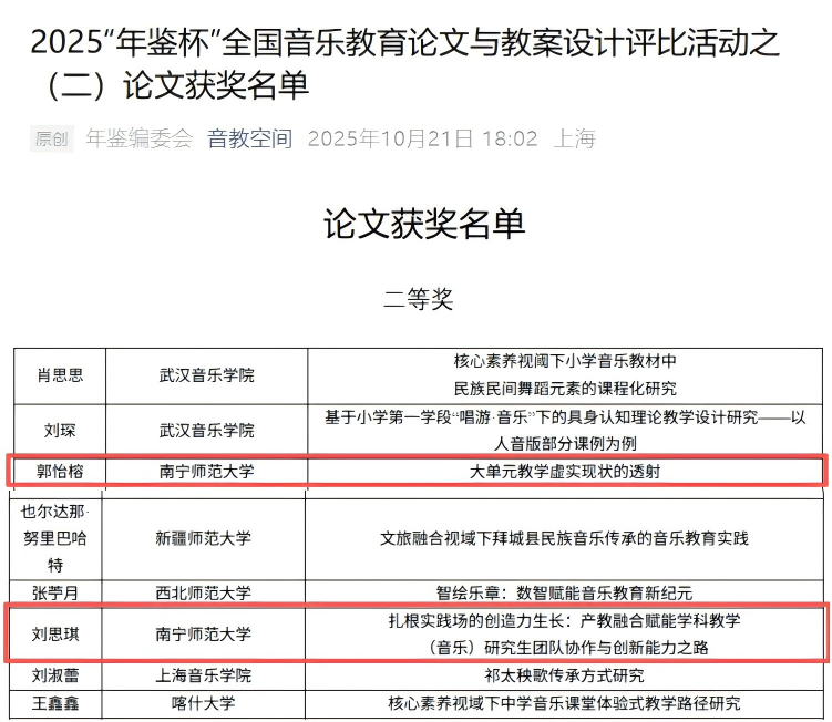 由《中国音乐教育年鉴》编委会主办,上海音乐学院承办的2025年“年鉴杯”全国音乐教育论文与教案设计评比活动近日圆满落幕。我校音乐与舞蹈学院研究生在比赛中表现优异,共有8名同学的12项作品获奖。