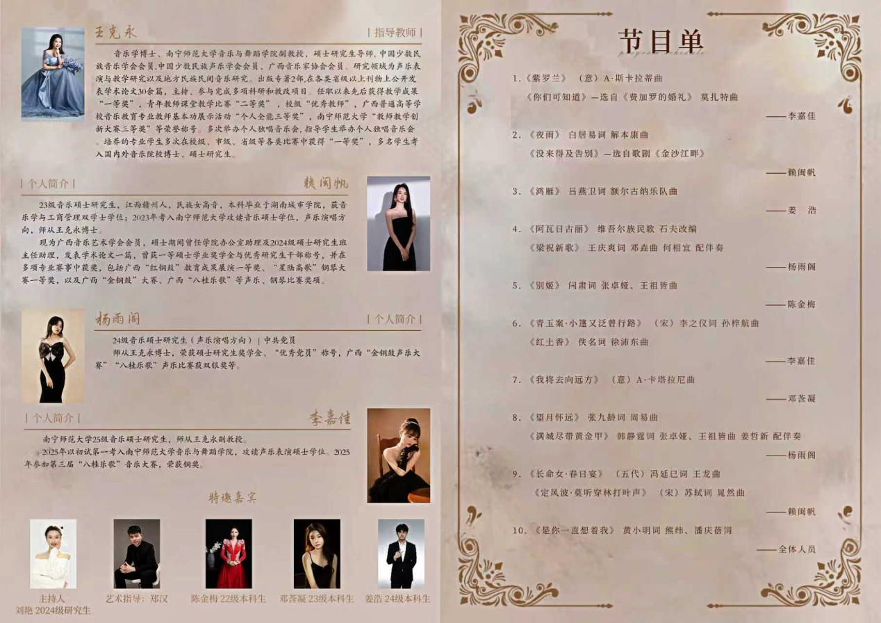 3月26日晚19:00,由南宁师范大学音乐与舞蹈学院主办、声乐系承办、王克永博士悉心指导的 “以歌之名,声动人心” 教学成果展(硕士专场)音乐会,在武鸣校区音乐与舞蹈学院音乐厅隆重上演。