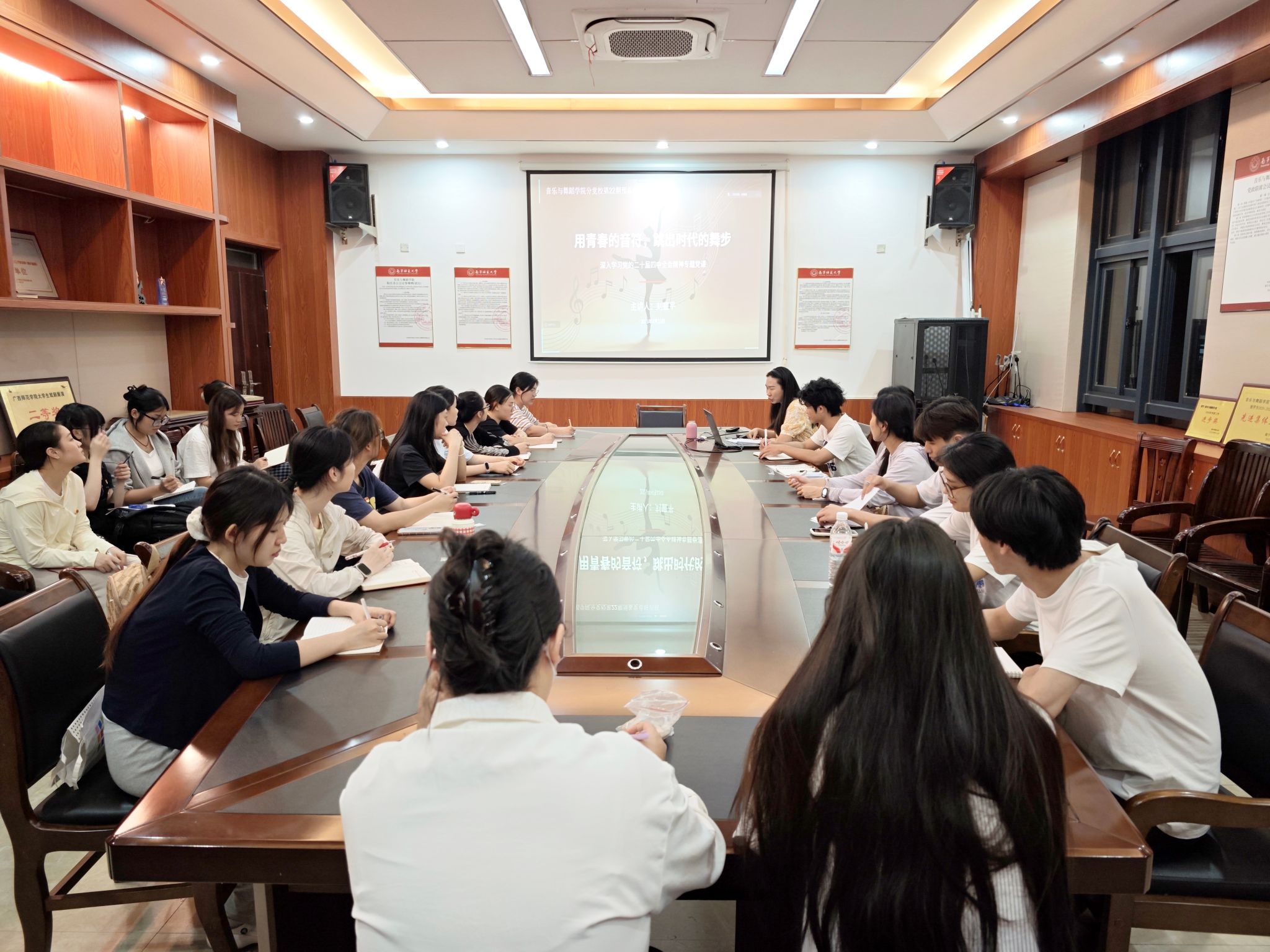 刘盛平从以《用青春的音符,跳出时代的舞步》为题,紧密结合艺术专业特点,深入解读党的二十届四中全会精神。她从“五年规划”的发展历程切入,系统阐释了“十五五”时期国家战略意图,并结合京桂共建中国—东盟AI艺术创作研究中心战略新部署,引导学员将国家战略与区域发展、专业学习有机结合。课程还结合学院学子参与涉外重要文艺演出的经历,生动阐释了讲好中国故事、传播好中国声音的现实意义,聚焦文旅演艺、中国—东盟文化交流、美育与社区艺术等方向,为学员明确了职业发展路径与实践方向。