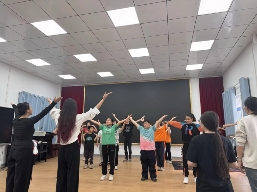 本次活动学院共招募57名青年志愿者,分组对接相声、舞蹈、吉他等5个特殊儿童的民族特色节目开展专业排练指导。志愿者们与特教老师紧密配合,耐心打磨动作与节奏,全程悉心陪伴特殊儿童,用专业与爱心搭建艺术沟通的桥梁。现各节目排练稳步推进,成效显著。