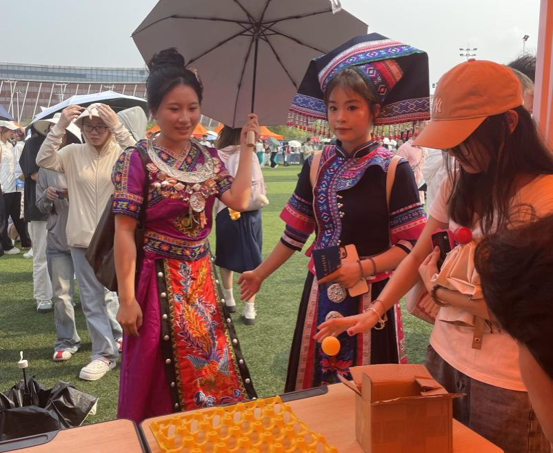 活动现场热闹非凡,我院打造的趣味非遗市集吸引众多学子驻足。乒乓球三连线,投壶等闯关游戏妙趣横生,通关者旋转抽奖转盘,即可赢取非遗刺绣杯垫、苗族冰箱贴、壮锦布袋等精美民族文创礼品。活动吸引两百余名师生踊跃参与,现场欢声笑语不断。